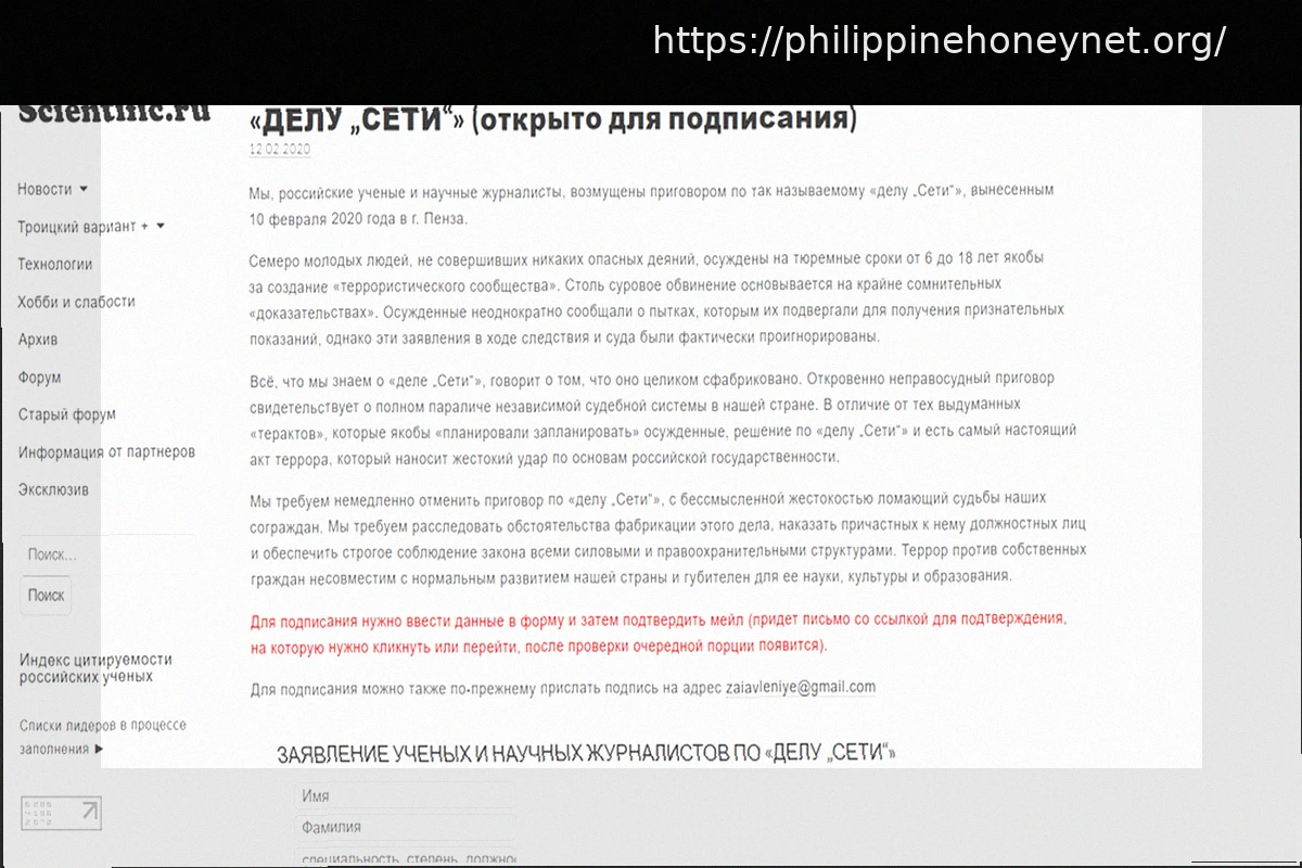 We, Russian scientists and science journalists, express our profound indignation concerning the verdict in the so-called ‘Set’ Case (also known as ‘The Network’ case), which was delivered on February 10, 2020, in Penza. This collective declaration highlights our deep concern over the legal proceedings and their implications, underscoring our commitment to justice and fundamental principles.